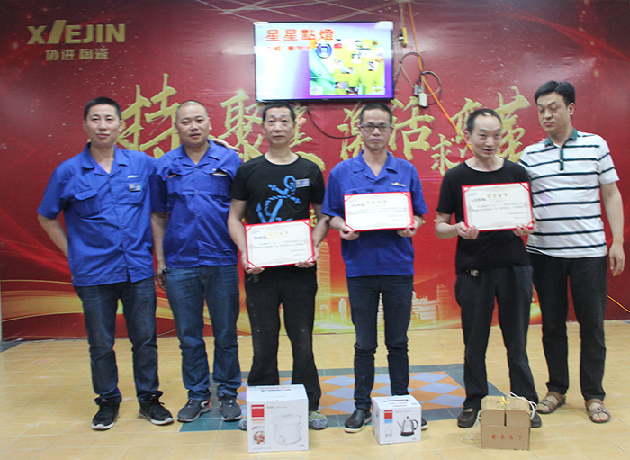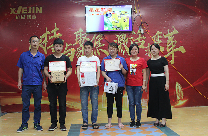晚會首先由馮先祿副總經(jīng)理宣讀《關于表彰慶祝2018年五一國際勞動節(jié)活動比賽優(yōu)勝者(團隊)的決定》。制造三課陳廷相、制造六課何金槍、制造五課王昌明等施釉技能比賽優(yōu)勝者;技術部楊永祥、吳林艷、張俊等對樣技能比賽優(yōu)勝者,以及制造三課代表隊、制造一部和品保部代表隊、倉儲課和行政后勤代表隊等4支趣味健身比賽優(yōu)勝團隊代表上臺接受公司領導的表彰。