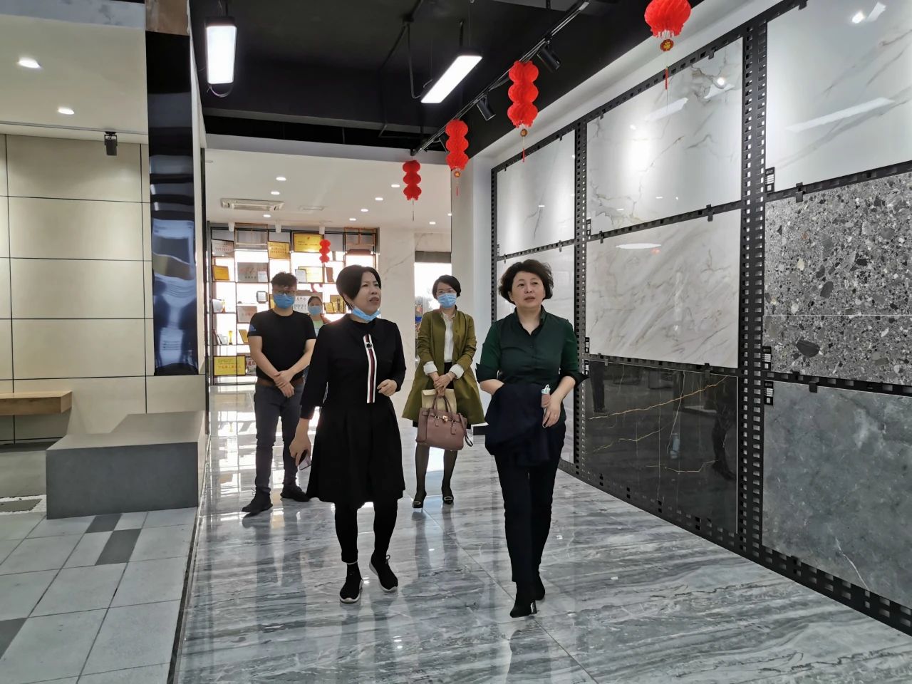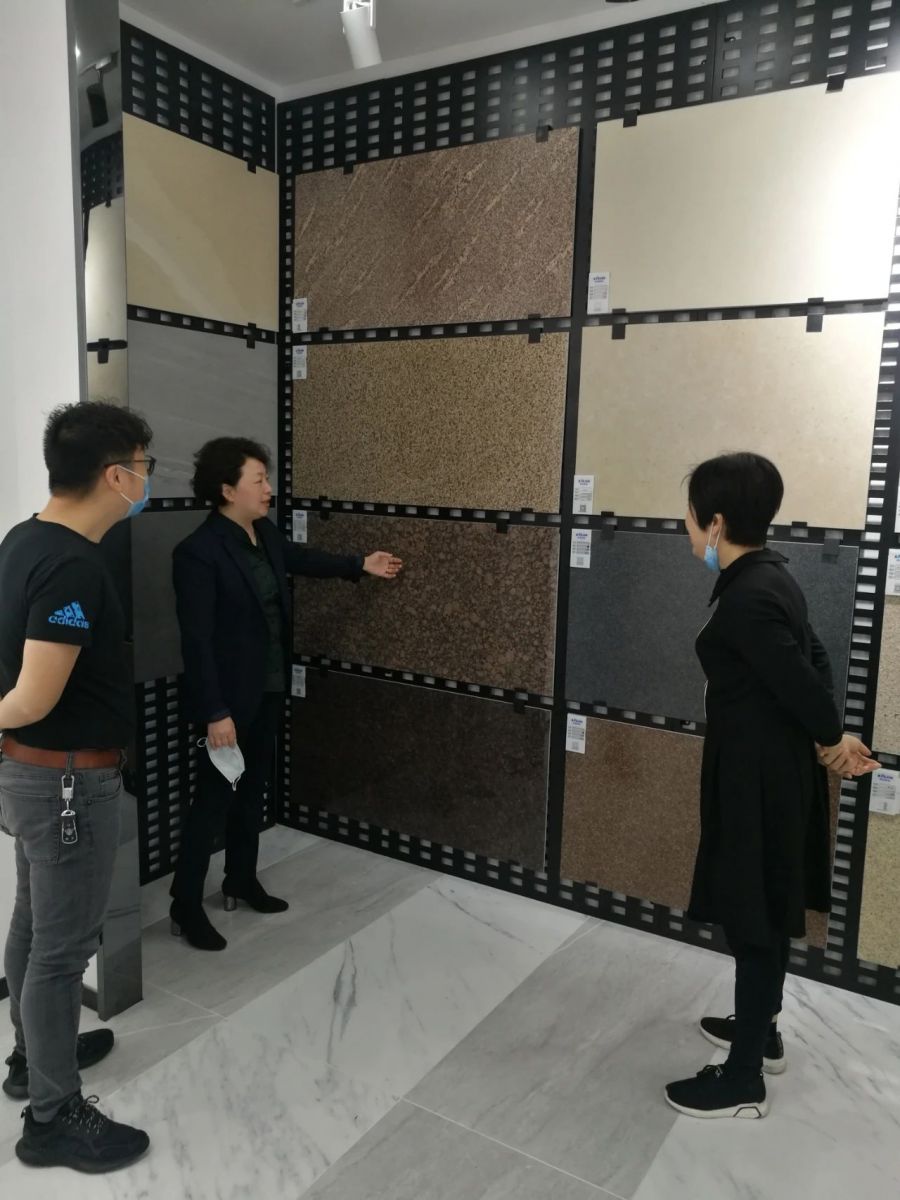曾檢察長一行在楊寶貴副董事長的介紹下饒有興趣地參觀了產(chǎn)品展廳,對協(xié)進(jìn)研發(fā)生產(chǎn)的一系列大規(guī)格薄板、大板、陶瓷薄板復(fù)合保溫一體板、巖板等綠色節(jié)能新產(chǎn)品,以及3D噴墨等工藝技術(shù)在瓷磚產(chǎn)品上的運(yùn)用贊嘆不已,不時(shí)詢問諸多產(chǎn)品在整體家裝領(lǐng)域的鋪貼使用效果。
